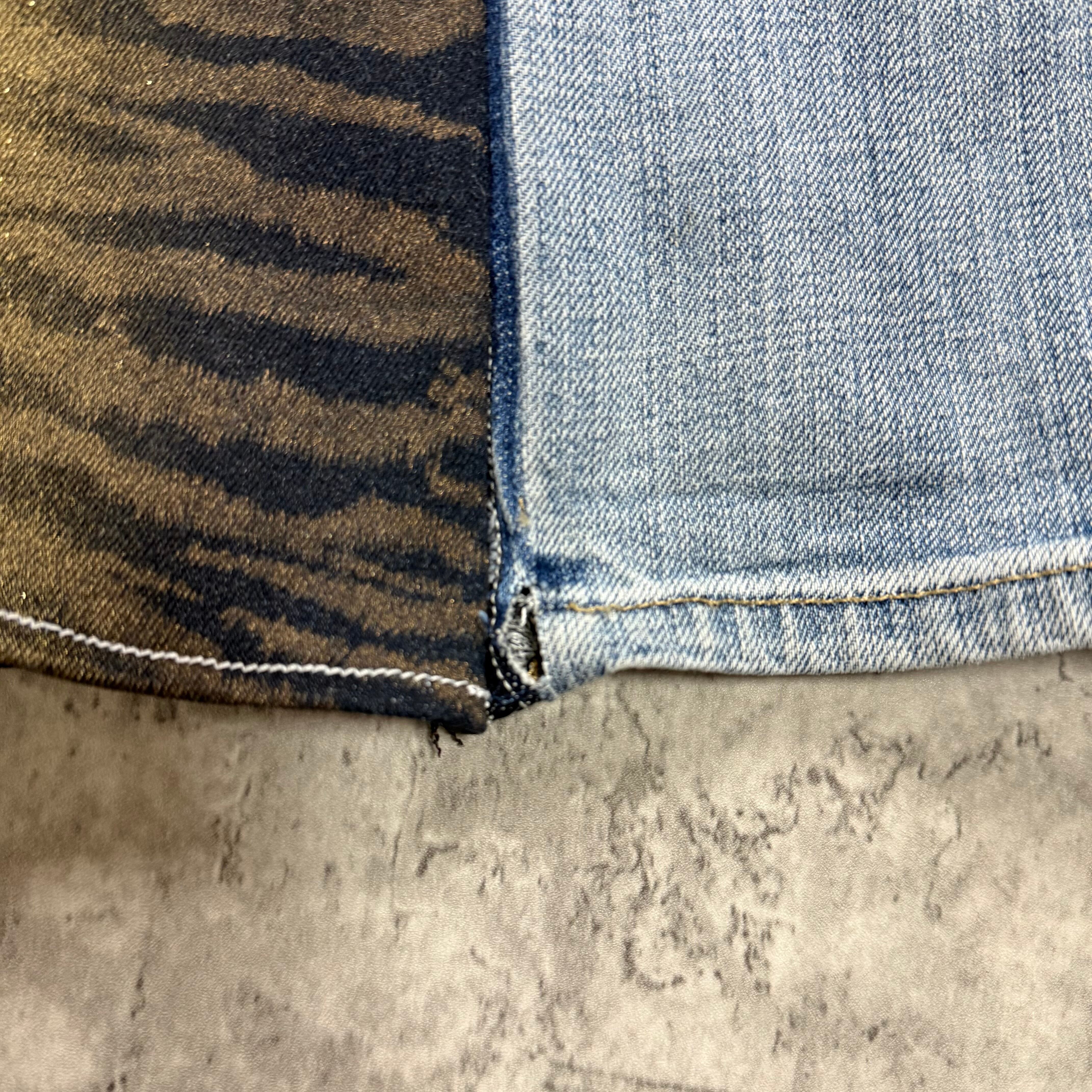 再構築されたリメイクデニムジーンズが新登場!個性的なゼブラ柄の切替が、あなたのスタイルを一層引き立てます。サイドラインフレアシルエットは、脚をスラッと見せる効果があり、カジュアルでありながらも洗練された印象を与えます。デニム特有の素材感が持つほど良いゆるさも魅力で、デイリーユースにはもちろん、特別な日のコーディネートにもピッタリ。スタイリングの幅が広がるこのアイテムで、あなたの個性を存分に表現してみてください!